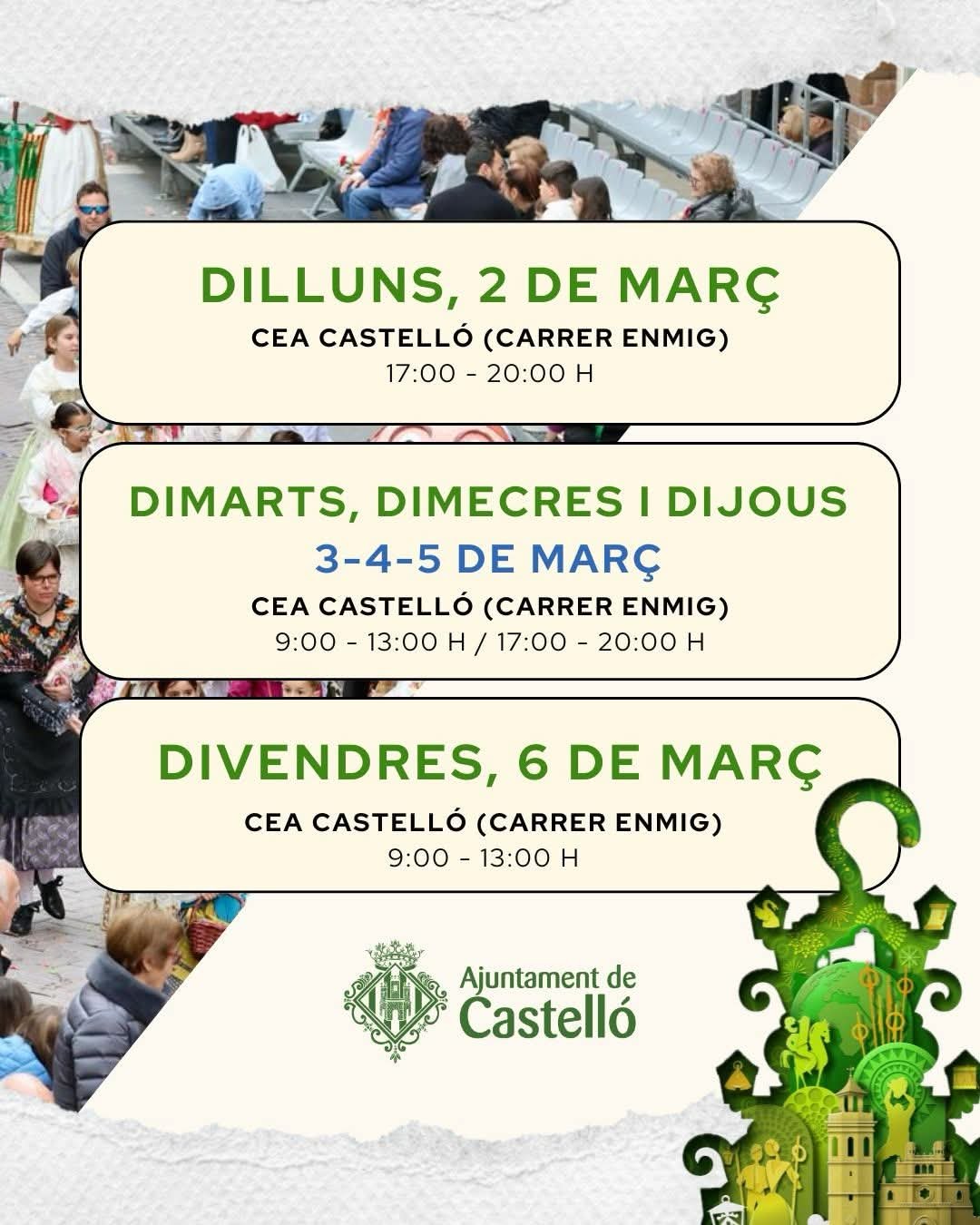 Si quieres ver los desfiles de la Magdalena con asiento reservado, pásate por el CEA Castellón (calle Enmedio) y compra tus tickets en los siguientes horarios:
